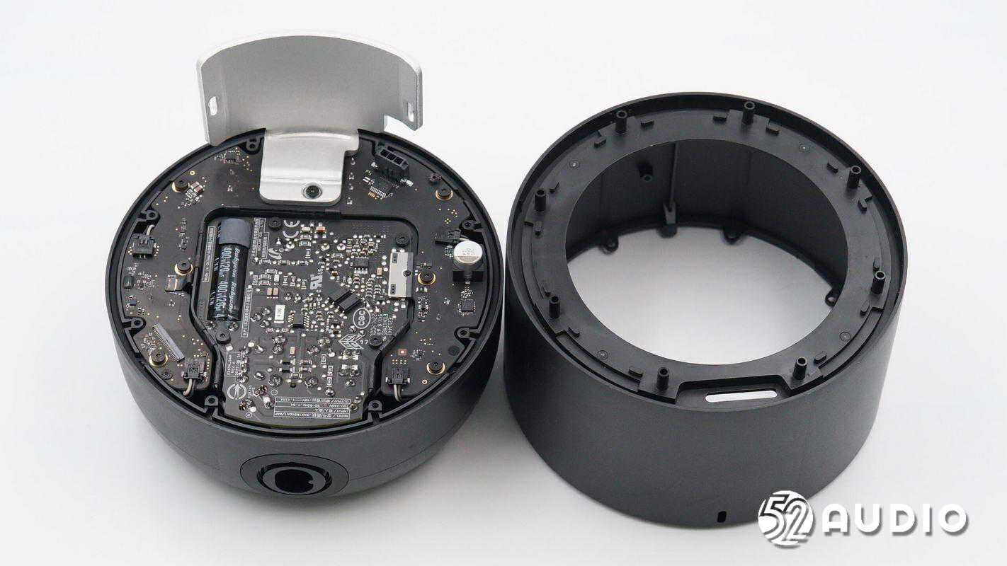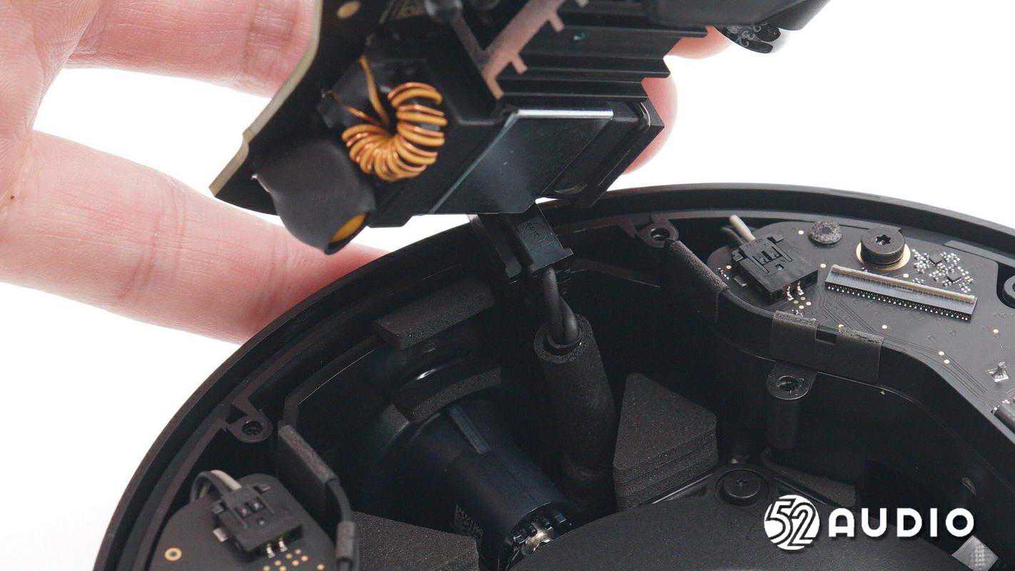 内部结构设计精妙,做工精致,主体结构分为上中下三层结构,上部分设置触摸板和主板单元,中间是低音单元腔体,下部分设置电源模块、功放电路板、5颗高音单元以及麦克风、温湿度感应器等。整体结构与上代区别不大,但结构衔接之间去除了胶水固定,元器件之间也均通过连接器连接,所有组件均可单独拆解替换,更加便于组装生产与后期维修。