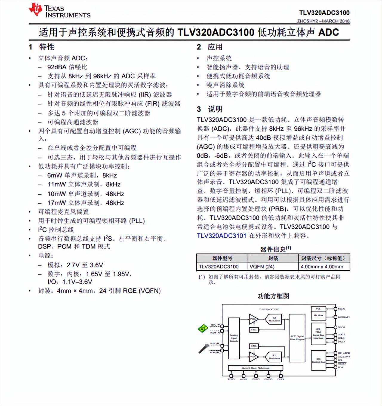 另外一颗TI德州仪器TLV320ADC3100低功耗、立体声音频模数转换器(ADC)。