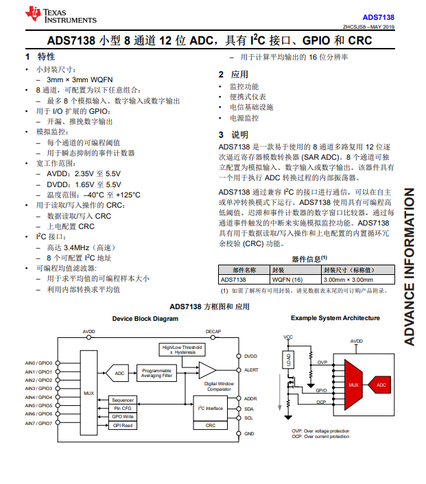 TI德州仪器ADS7138是一款易于使用的8通道多路复用12位逐次逼近寄存器模数转换器(SARADC)。8个通道可独立配置为模拟输入、数字输入或数字输出。该器件具有一个用于执行ADC转换过程的内部振荡器。ADS7138通过兼容I²C的接口进行通信,可以在自主或单冲转换模式下运行。