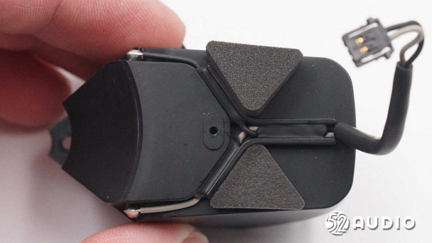 腔体底部结构一览,对应高音单元位置设置海绵垫缓冲,中间排线连接调试触点。
