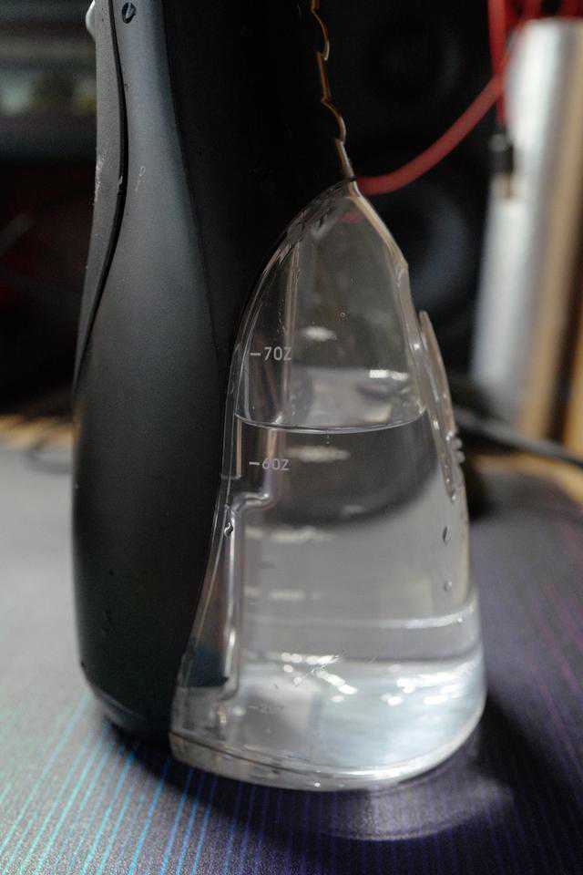 我拿到的洁碧冲牙器是黑色款,除水箱外通体黑色看起来很是美观,透明的水箱设计为200ml的容量。冲牙器主体采用了符合人体工程学的收腰设计,而且在收腰的位置还采用了防滑的设计,手感很好,有水的时候也不会滑。