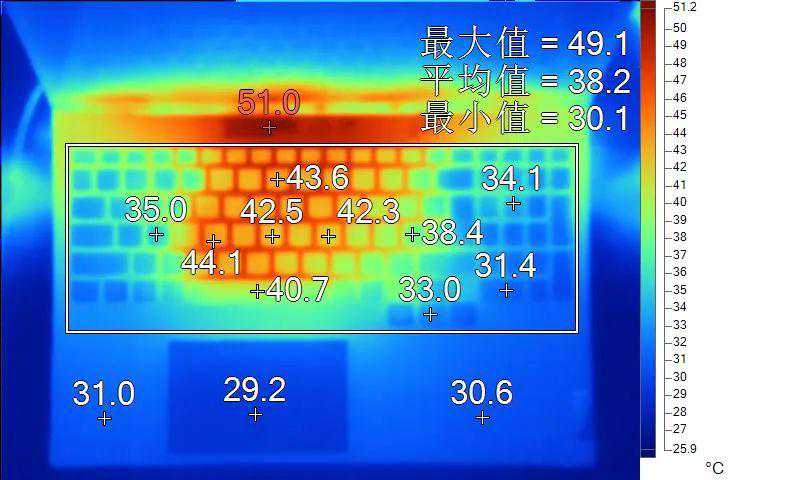 表面温度如上图所示,键盘键帽最高43.6℃出现在7键处,WASD键附近约为35.0℃,方向键33.0℃。左腕托温度为31.0℃。