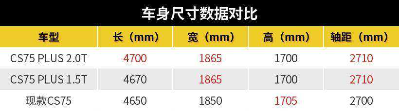 2.车身尺寸方面,CS75PLUS与现款车型差别不大,但是2.0T车型由于前后保险杠的造型差异,相比1.5T车型,在车身长度方面有所增加。整体来看,CS75PLUS的整车尺寸相比于同级别的竞品车型还是有一定优势的。