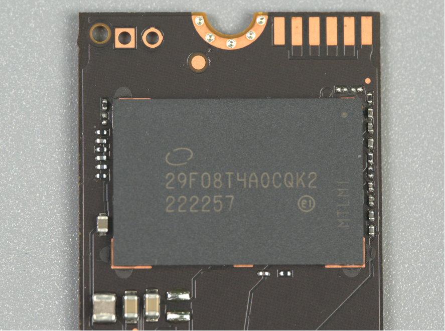 PCB的另一端则是一颗NANDFlash,编号为29F08T4AOCQK2。从编号可知其为8Tb容量(QLC模式下),x8die封装,144层3D工艺。得益于领先的介质容量和高密度的封装,单芯片即实现了1TB的容量。