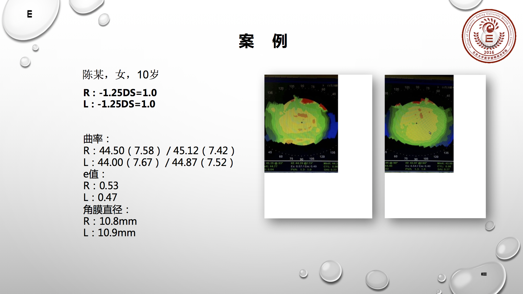 最后这个案例是露晰得的经典案例,一百多度近视,十岁,曲率偏陡,e值0.5左右,角膜直径偏小:10.8~10.9;最终给的试戴片的选择是10.2的直径。从右上图来看,还不错,对不对?但最后定片参数是10.0,若我来选择镜片直径应会选择10.2。该患者戴镜一天时,她的镜片稍微有点往上走,所以我会选10.2的直径。当然她戴镜一周后还是不错的。