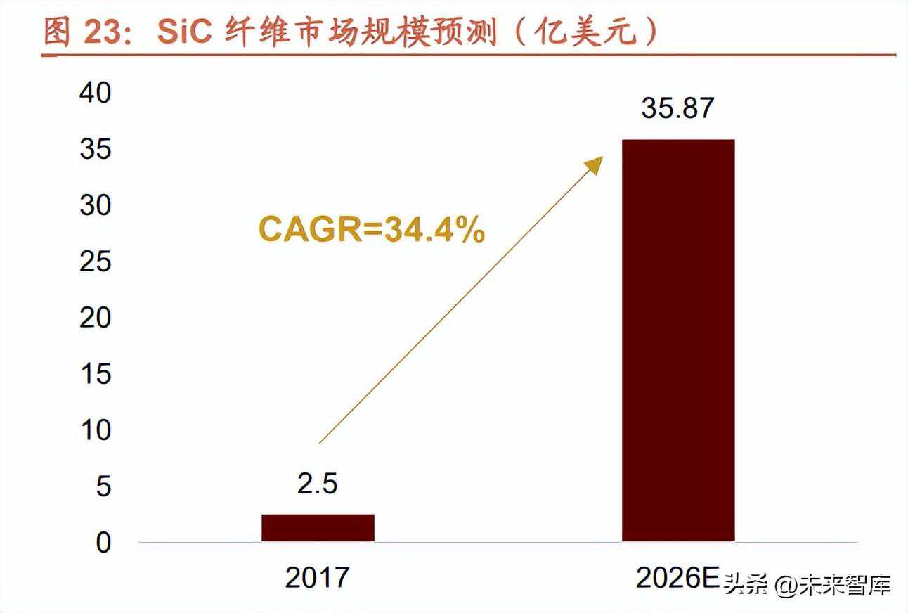 预计未来各国对航空航天领域的投入加大,推动SiC纤维规模高速增长。根据StratisticsMRC预测,2026年SiC纤维的市场规模将增长至35.87亿美元,2017~2026年间复合年增长率将达到34.4%。SiC纤维下游最主要的应用之一是SiC纤维复合陶瓷基材料(CMC材料),未来十年,伴随着综合国力的增强以及国际形势的不确定性,以中国为代表的主要发展中国家有望加大航空航天领域的投入力度。在此背景下,凭借轻量化、高耐热、抗氧化的显著优势,CMC材料的使用率有望大幅增长。根据MarketsandMarkets预测,到2031年,全球CMC材料市场规模将达到250亿美元,2021~2031年间复合年增长率将达到11.0%。