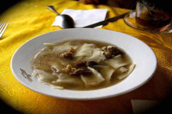 (旁边的就是色楞格河了,一路下着小雨,都是清新的绿色。)在乌兰巴托之后的这段我就建议大家不要去打牌玩耍了,毕竟这样的草原不是哪里都有的,一路上你还可以看到蒙古家庭在地上撑起小帐篷野餐的场景,心向往之。陶醉一下午之后又到了晚餐的时间!(怎么就知道吃!)蒙古餐车在这个时候发了大招,有牛排!按照官方汇率大约90-110元左右的价格,但是比国内的王品和西提不知道要值多少!牛肉很好,但大厨采用了是风干的蒙古做法,上面加上一点孜然和白胡椒,特别好吃。有图么?好吧,别打我,没有我和老爸先点了一份,吃完想起了我擦!没有照相!因为量不是很大,所以又要了一份,但是刚一上桌我们又开吃了,吃到一半发现似乎忘了什么于是只能补一张牛肉面片汤了,合人民币大约30元左右。