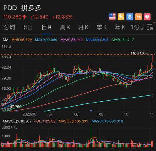 短短两天内,拼多多的股价再创新高,从91.62美金涨到了110.26美金,一共涨了20.34%,市值共飙升223亿美金,约合1500亿人民币。