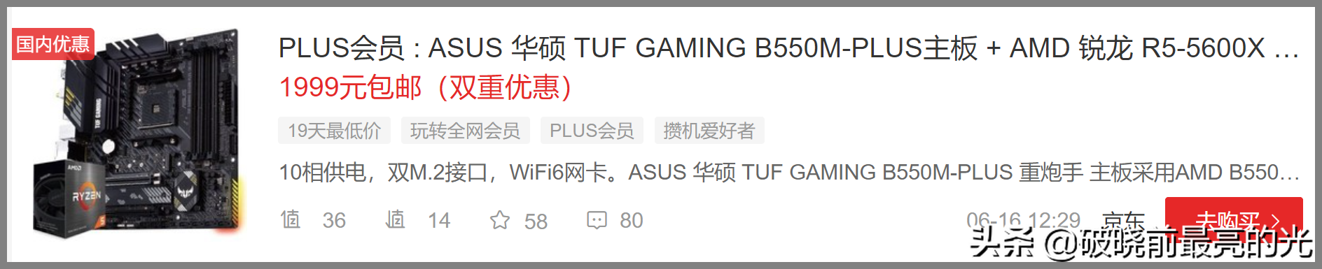 前几天(06.16)京东板U套装突然降到史低,在群里激起一阵抢购狂潮。上午出史低价格,下午出个更低的价格秒了上午的爆料。很多人退款了上午拍下的板U套装,买了下午新出的爆料款,譬如1999元的R5560......