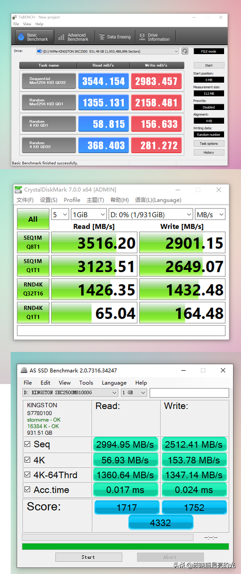 ▼金士顿KC2500,金士顿用于对标新款SN750的产品,中的性能第一梯队。