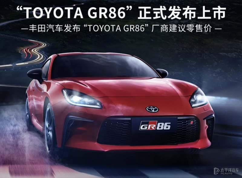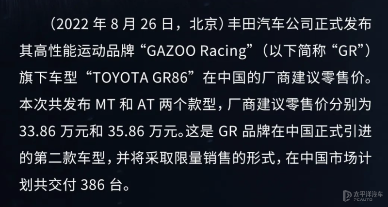 【太平洋汽车网新车频道】8月26日,我们从丰田官方获悉,丰田全新GR86正式上市,共推出2款车型,售价区间为33.86-35.86万元,限量386台。同时由于因为中国相关排放法规以及标准的原因,新车仅......