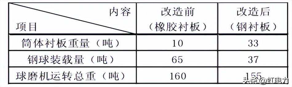 选用FGDM3280型球磨机为改造对象,改造前后的重量对比见表3,改造后磨机运行总重量少5吨,这样就不需要对控制系统和驱动装置改造,简单可行。
