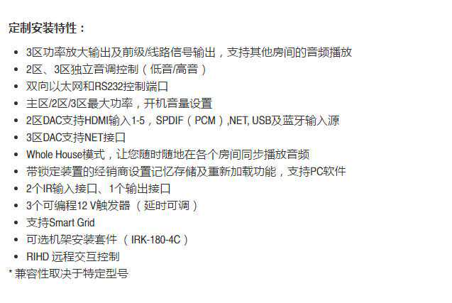 定制安装就是服务于豪宅,多房间和远距离的多媒体传输,这是普通家庭影院功放所不具备也不需要的功能。