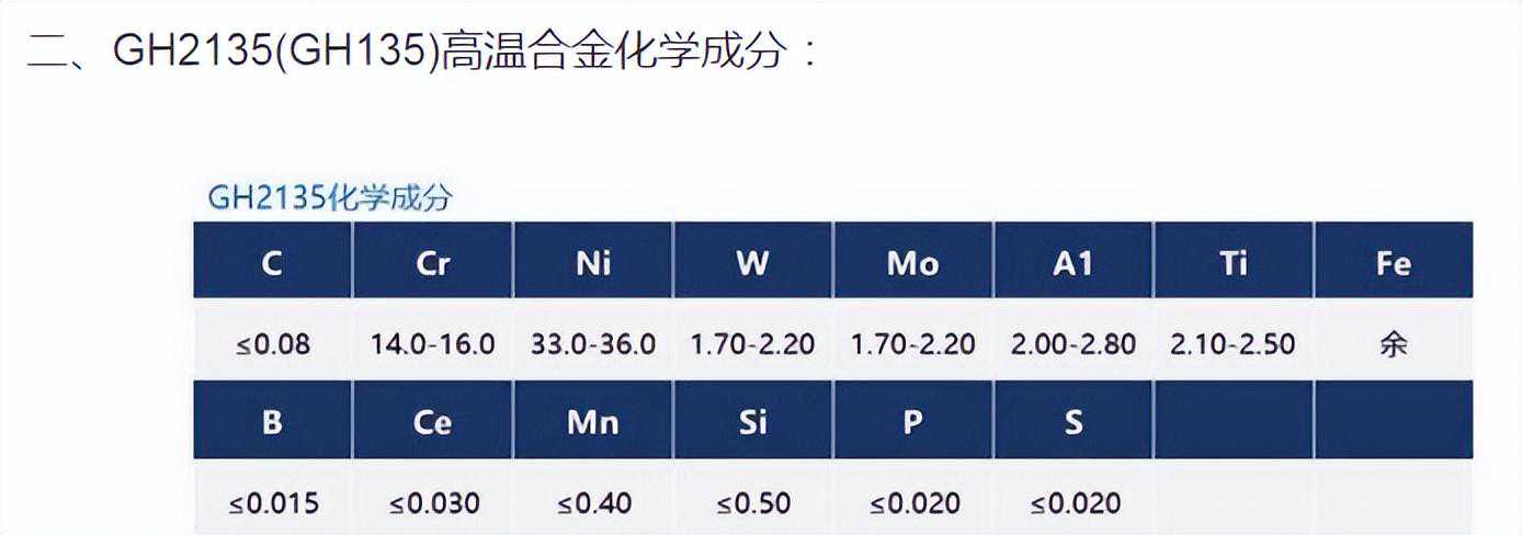 GH2135(GH135)高温合金是我国自行研制的铁镍基高温合金,除疲劳性能稍低外其余性能已达到和超过了镍基合金gh33的水平。合金具有良好的热加工塑性,但切削加工性能较差;经表面渗铝后抗扪化性能较好。实践证明该合金比较成熟,使用可靠。使用温度500-1000℃有,和来制造航空、航天、燃气涡轮机及其他工业用的一般承力件。