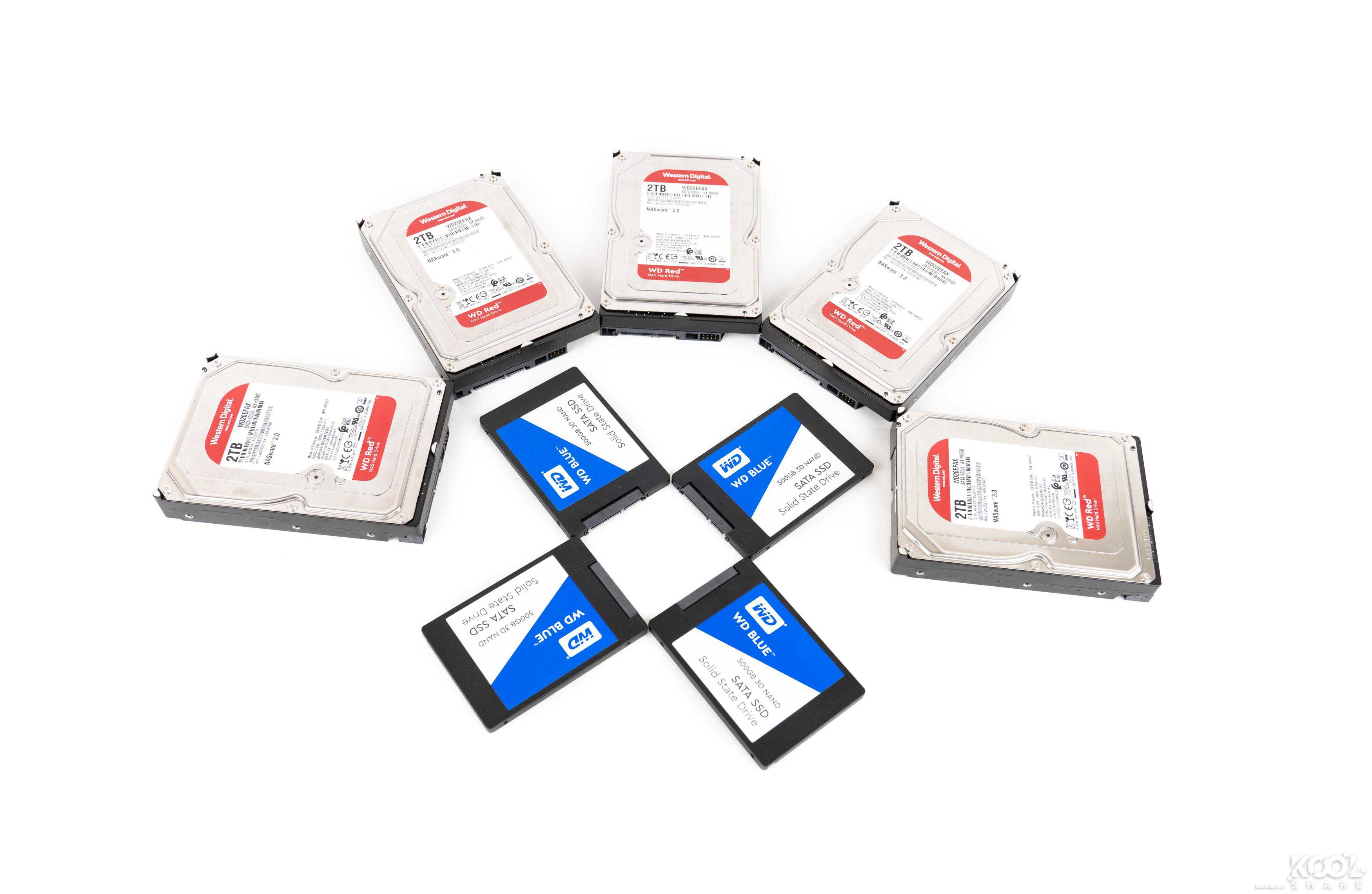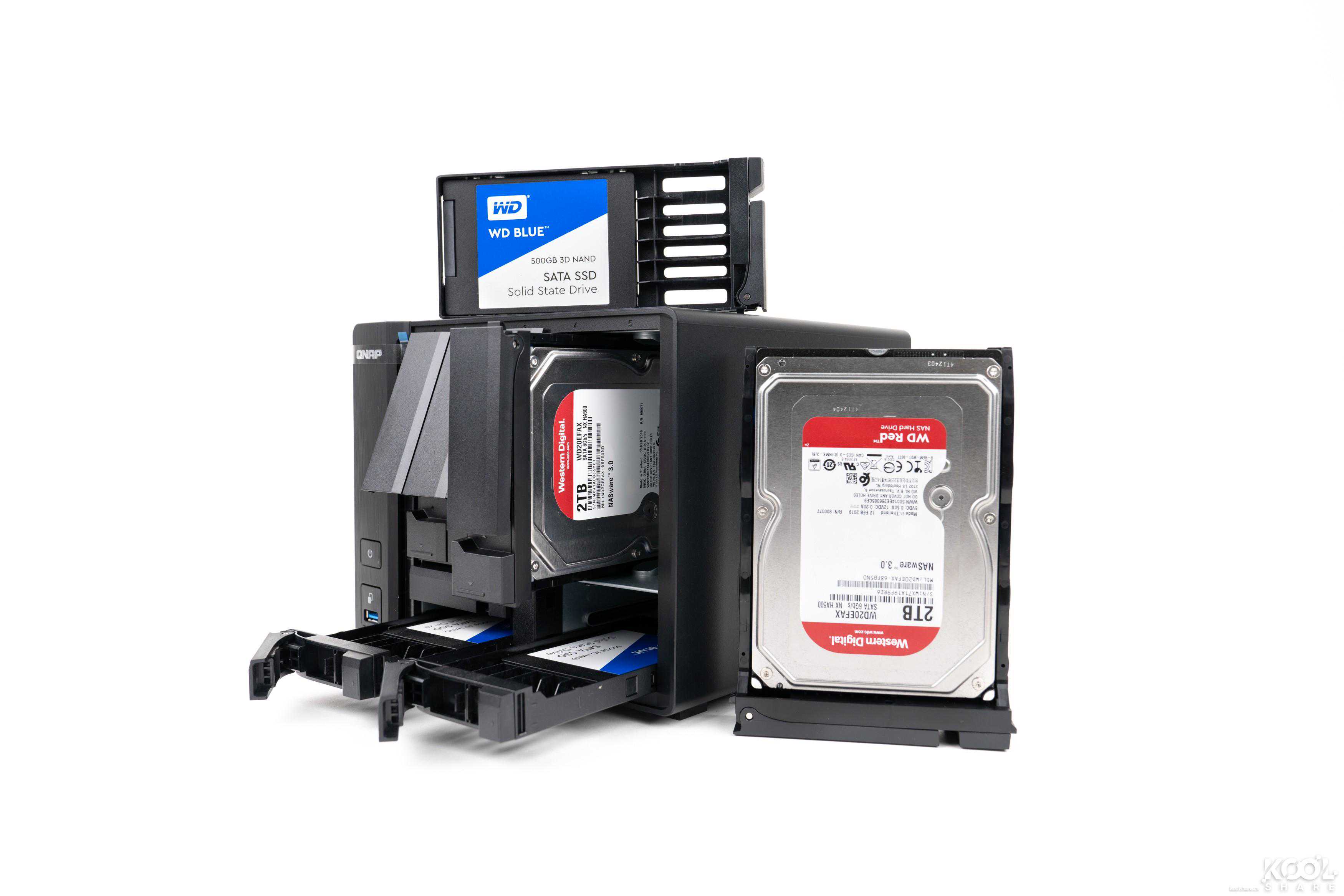 ▲这次为QNAPTVS-951N搭载的是来自WesternDigital的5块RED2T硬盘和4块500GSATASSD蓝盘