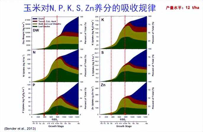 观察任何指标,都可以发现外围的S型曲线从拔节期开始,养分需求或干物质累积出现第一个峰值,表示快速增长。在吐丝期之后,即授粉完成后进入灌浆期,又出现了一个二次高峰,说明玉米的干物质累积和养分需求在整个生长发育过程中呈现规律性变化。特别是氮、磷、钾和锌,它们的需求都表现为两个高峰,即两次吸收高峰。也就相当于刚才跟大家提到的,除了我们早期的施肥以外,我们花后的养分的供应也非常的重要。