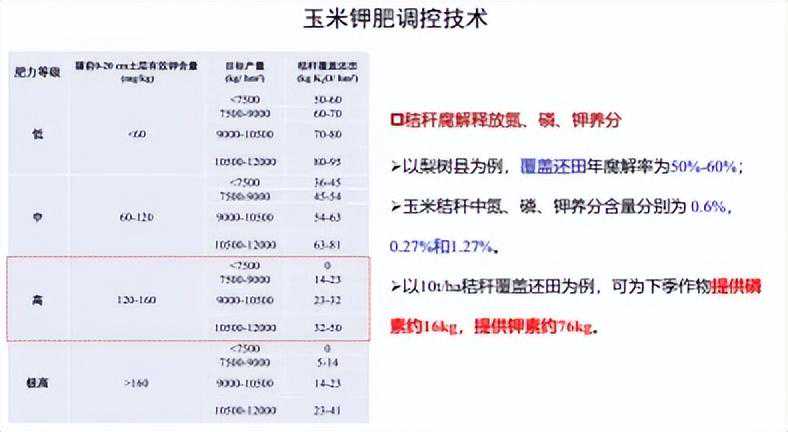 在钾肥管理方面,我们也建立了一个推荐施肥的指标体系。如果土壤中的数值在120到160范围内,它被认为是处于高钾水平。右边我举了一个简例,以梨树为例,在泉眼沟实验站,我们使用尼龙袋装载秸秆并固定在土壤表面,以测量其在覆盖条件下的腐解率。测得的结果是50%-60%。由于使用了尼龙袋,它起到了让秸秆与土壤不直接接触的作用,因此腐解率相对较低。然而,它也是一个可量化的指标。在腐解率50%-60%的基础上,我们考虑了玉米秸秆中钾的含量,为1.27%。以十吨产量为例,假设1:10吨全量覆盖还田。实际上,在实际生产中,即使收获时全量抛洒在地表,经过冬天各种因素影响,实质性的还田量不可能达到全部还田。因此,我们按照十吨的理论数值进行计算,即十吨乘以最高腐解率60%,再乘以钾含量0.127%,最后得出可以提供76公斤的钾肥。在秸秆腐解过程中,秸秆的腐解比例与其释放的养分(氮、磷、钾)比例并不一致。通过埋袋和地表放置的实验都表明,养分的释放比例远大于秸秆的腐解比例。因此,保守估计,考虑到各种因素,全量十吨秸秆还田后,补充的钾至少能在50公斤左右。