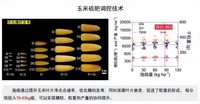 在梨树的主要土壤类型,如黑土和风沙土,以及吉林省东部西部的一些土壤上,我们进行了关于硫肥管理的梯度实验。最终得出的结论是,施用硫肥首先改善了叶片的光合作用,增强了干物质的累积能力,其次优化了穗的发育,并减缓了叶片的衰老,最终增加了粒重,从而提高了产量。通过多个产量的模拟数据,发现推荐的硫肥用量大约在76到85千克每公顷。当然,硫肥可以使用硫酸钾替代原有的BB肥中的氯基氯化钾,来提供硫元素。