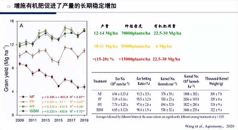 上述内容讨论了从氮、磷、钾、硫、锌等无机化学肥料的角度出发的简要施肥技术。另一个重要的原则是有机与无机肥料的配合使用。这张图片展示了在王家桥从2009年开始进行的连续几个四加X实验。实验对比了施用有机肥与不施用有机肥的处理。图片中上方的两条线代表施用有机肥的处理,而中间的线代表仅施用化肥而不施用有机肥的常规施肥处理。这是11年的数据总结,涵盖2009至2019年间,包括不同天气条件下的表现。尽管存在干旱和多雨的年份变化,整体数据显示出稳定的增加趋势。而常规施肥处理的数据波动较大,如果连成一条线,则显示出相对平坦的趋势。通过这两个处理的对比,可以发现它们之间的差异主要在于有机肥的使用。有机肥的用量在22.5吨至30吨每公顷之间。同时,产量水平不同也与种植密度不同有关。在常规条件下,自2009年起设置的实验中,种植密度为55000株。而施用有机肥的两个处理种植密度达到7万株每公顷。这表明通过有机无机施肥和合理增密,可以提升产量潜力。同时,维持产量稳定性也是一个重要问题。特别是对于适度规模化经营而言,产量稳定性比连续增产更为关键,这在一定范围内可能更具优势。