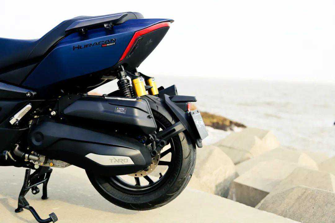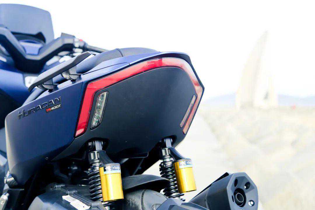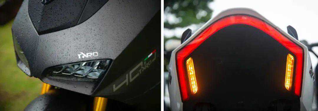 车身前部配备两个带阻尼开关设计的储物格,放置一些随身的小物件。带呼吸灯的智能锁设计,一键启动功能。倒置可调前减震。坐垫为前后一体,中段有前后座区隔落差,也可以为驾驶员提供一部分腰部支撑。尾灯部分采用细窄贯穿式的线性设计。油箱容积14L,续航能力300km以上还是没有问题的。